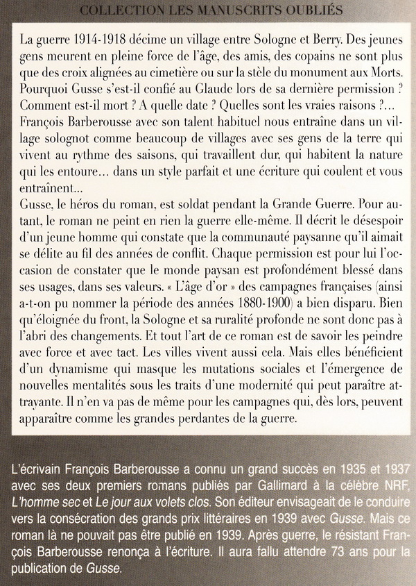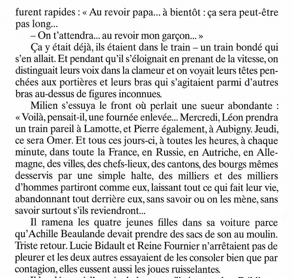 Le départ pour la guerreExtrait du roman de François Barberousse "GUSSE" - Ed. MarivolEMobilisés en aout 1914 les conscrits d'un village de Sologne partent...